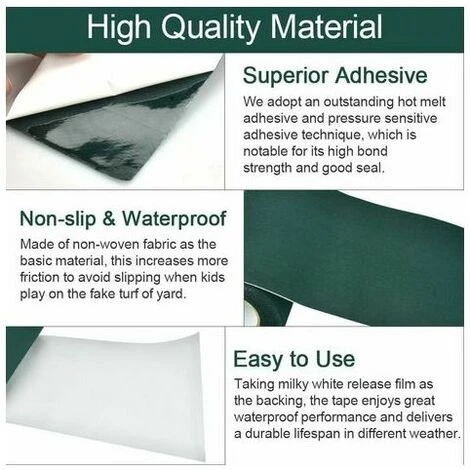 Matériaux de haute qualité: Le ruban adhésif pour gazon artificiel est composé d’un matériau de base et d’un film de séparation blanc laiteux comme support. Il est durable et antidérapant, a les propriétés imperméables, résistantes aux intempéries et aux UV, et peut résister efficacement à l’invasion du mauvais temps. L’aspect vert foncé peut être bien caché dans le gazon sans détruire toute la beauté.