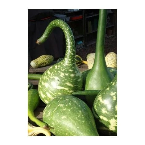 La courge calebasse col de cygne est une courge vert foncé, tachetée de blanc, en forme de cou de cygne. Très décorative mais non comestible. Une fois sèche, vous pourrez aussi la peindre ! Plante grimpante très décorative pour pergolas, tonnelles. Culture facile. Une fois sèche, vous pourrez les nettoyer et les cirer ou vernir !