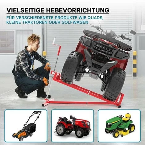 Le cric lève tracteur qui est en métal est donc un soutien indispensable pour les travaux de maintenance et de nettoyage des tondeuses autoportées et d’engins similairement lourds. Vous pouvez facilement conduire l’engin qui doit être nettoyé sur le cric. Ensuite avec l’aide de la manivelle, vous pouvez relever votre engin en toute sécurité et sans grands efforts notables. L’angle d’inclinaison est réglable en continu.