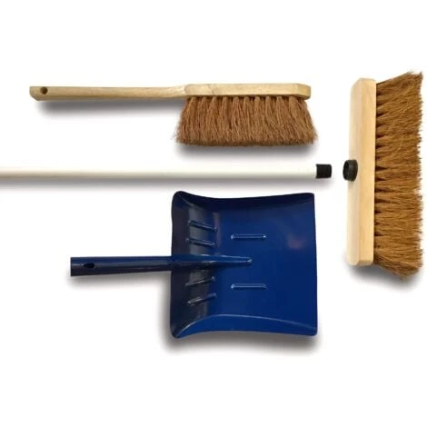 Ensemble balai brosse de ménage d’atelier | 1 balai coco 29cm avec manche acier gainé couleur selon arrivage| Pelle tôle laquée bleue | Balayette en fibres de coco naturel manche long | Kibros 3LOTPBb