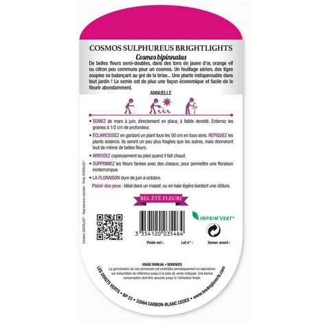De belles fleurs semi-doubles, dans des tons de jaune d’or, orange vif ou citron peu communs pour un cosmos. Un feuillage aérien, des tiges souples se balançant au gré de la brise… Une plante indispensable dans tout jardin ! Le semis est de plus une façon économique et facile de le fleurir abondamment.
