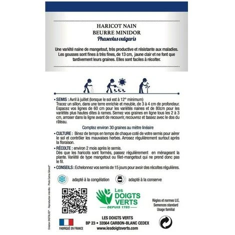 Le Haricot nain beurre minidor est une variété naine de mangetout, très productive et résistante aux maladies. Les gousses sont fines à très fines, de 13 cm, jaune clair et ne font que tardivement leurs graines. Elles sont faciles à récolter.