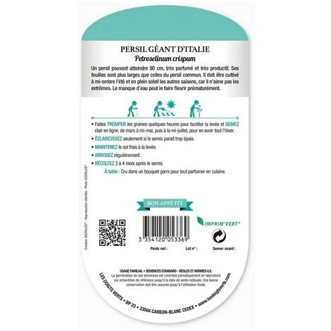 Un persil pouvant atteindre 80 cm, très parfumé et très productif. Ses feuilles sont plus larges que celles du persil commun. Il doit être cultivé à mi-ombre l’été et en plein soleil les autres saisons, car il n’aime pas les extrêmes. Le manque d’eau peut le faire fleurir prématurément.
