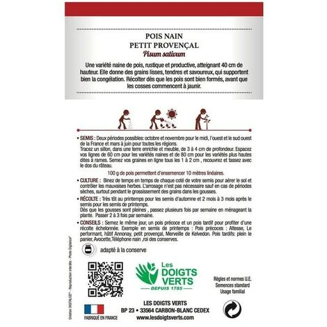 Le Pois nain petit provençal est une variété naine de pois, rustique et productive, atteignant 40 cm de hauteur. Elle donne des grains lisses, tendres et savoureux, qui supportent bien la congélation. Récolter dès que les pois sont bien formés, avant que les cosses commencent à jaunir.