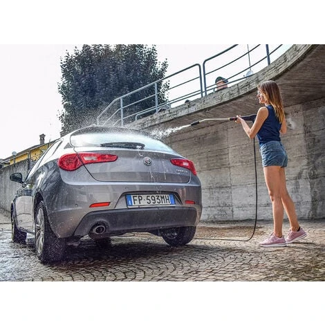 – Accessoires professionels inclus: pistolet, flexible haute pression 10 mètres, lance en métal, 5 buses, tuyau d’arrosage 2,5 mètres