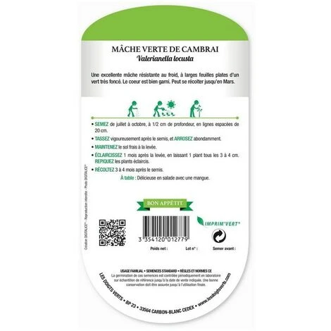 Une excellente mâche résistante au froid, à larges feuilles plates d’un vert très foncé. Le coeur est bien garni. Peut se récolter jusqu’en Mars.