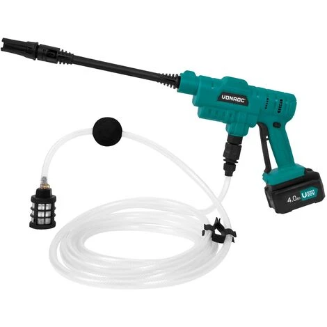 Ce petit concentré de puissance est alimenté par batterie, vous ne serez donc gêné par aucun câble. Tout ce que vous avez à faire, c’est de raccorder le tuyau avant de vous mettre au travail. Pas de robinet à proximité ? Aucun problème ! Grâce à son kit Tuyau d’aspiration avec filtre, vous pouvez tirer l’eau depuis presque n’importe quelle source. Un seau, un jerrican, un récupérateur d’eau de pluie par exemple. Mais un ruisseau ou une rivière pourra aussi bien faire l’affaire. Plongez le tuyau et c’est parti !