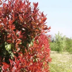 Son feuillage est persistant, rouge, et cuivré. Avant de tomber, les feuilles les plus anciennes virent au jaune rouge ou rouge foncé. La floraison blanc – blanc crème du photinia au printemps est abondante et parfumée.