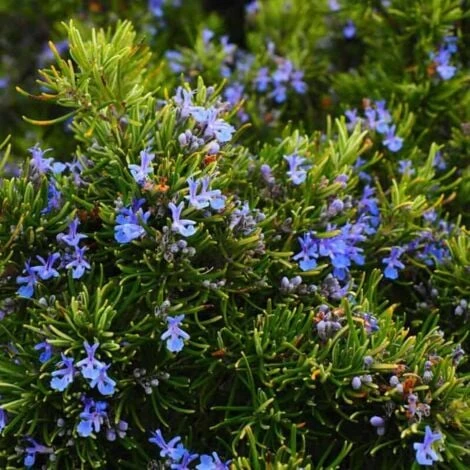 Arbrisseau au port érigé, le rosmarinus officinalis fleurit bleu-violet de l’hiver au début de l’automne. Il s’adapte facilement aux climats un peu secs et arides, dans des massifs rocailleux, des plates-bandes… Croissance lente. Le feuillage persistant du romarin est aromatique, vert foncé sur le dessus mais blanc argenté en dessous.