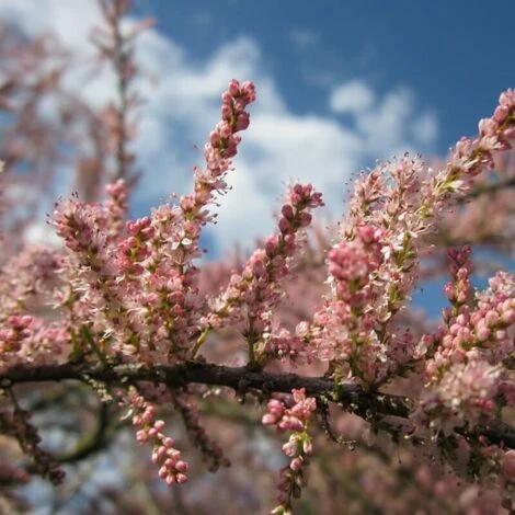 Très bel arbuste au port étalé, buissonnant, ce tamaris fournit en été sur le bois de l’année une floraison rose clair et des fruits sans intérêt. Les branches sont souples, arquées, ce qui lui confère un port léger. Pentendra signifie à cinq pétales, comme sont ses fleurs, et Ramosissima veut dire très branchu.