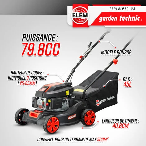 Cette tondeuse à gazon équipée d’un moteur thermique 79.8 CC possède une largeur de travail de 40.6 cm ce qui en fait l’outil idéal pour la tonte de terrain de surface moyenne. Légère et simple d’utilisation, elle convient à tous les types de terrains. Grâce à un bac récolteur d’une capacité de 45 L, cette tondeuse vous facilite le stockage ainsi que le transport de l’herbe coupé.